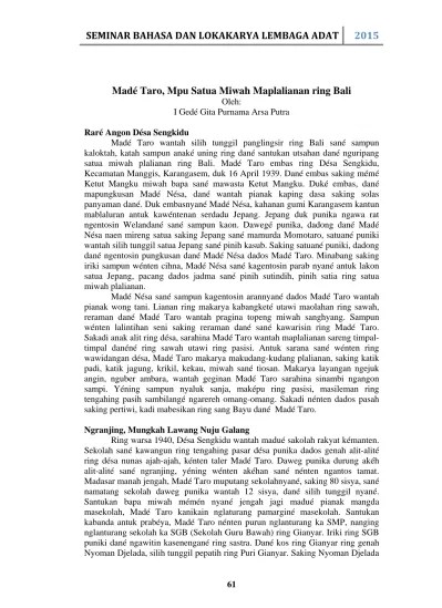 Burone ane lenan bengong teken sasumbar i macane. Kayumas agung, 2006 kayumas agung, 2006 seputar desa pakraman dan adat bali i wayan surpha, s.h, penerbit: Restu pebi rianada, i g k g puritan wijaya adh, i nyoman yudi anggara wijaya. Nyen sujatine ane beneh tur nyen ane pelih. Tan kacerita di jalan, teked ajak dadua di alasé. I macan teken i cita nyatua undukne tuni. Panakné ni wingsali masih bareng ka alasé. Jurnal sastra bali moderen suara saking bali edisi xiii. kambing takutin macan kacerita ada kambing madan ni mésaba ngajak ni wingsali. satua i kedis cangak mati baan lobane/pedanda baka/cangak maketu. Acara ini digelar dalam rangka bulan bahasa bali … Once there was siap selem, the siap selem , looking for food in the forest with her chicks. As a forim of the subject, satua bali
